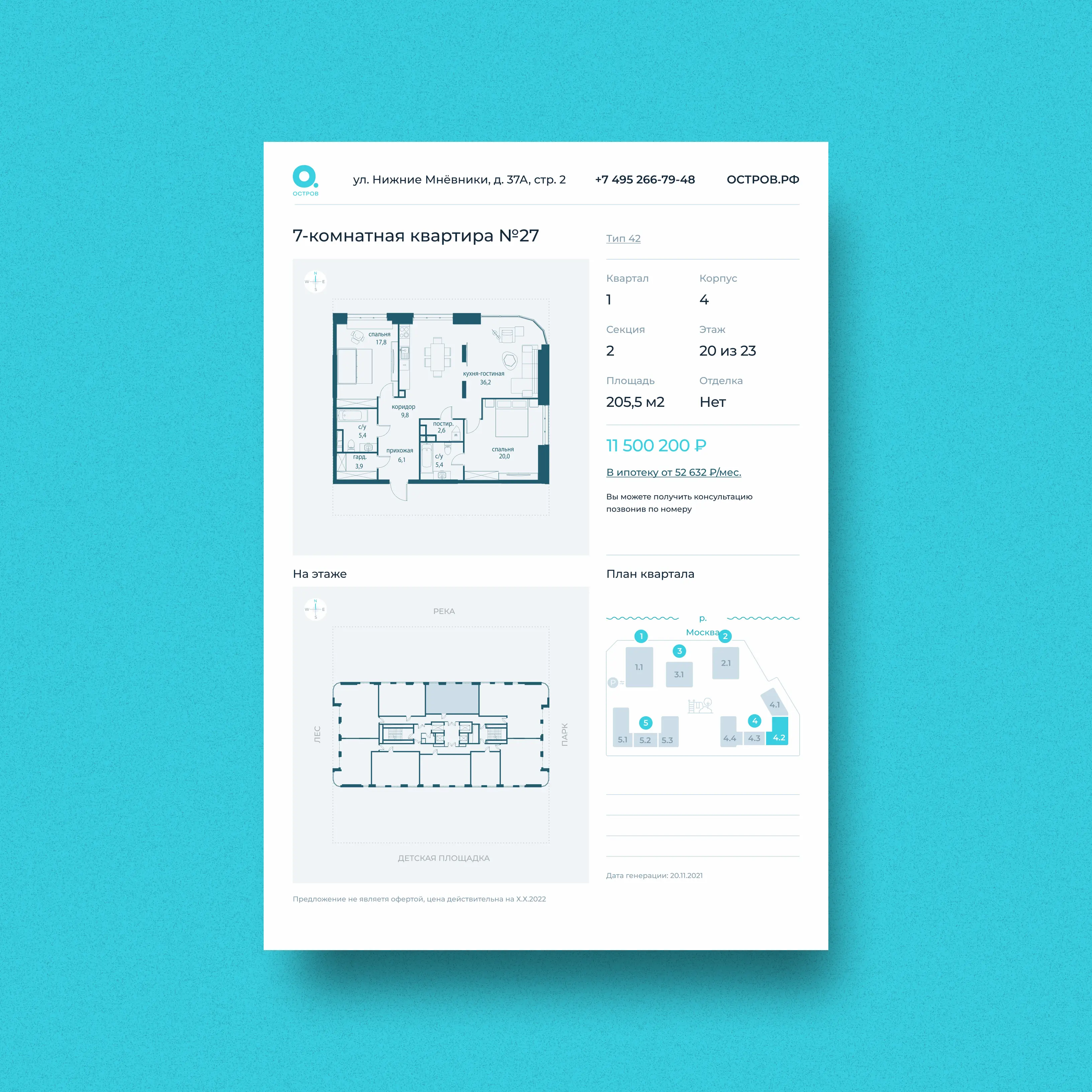 На каждую квартиру выдаётся своя карточка с планировкой, основными характеристиками, расположением на этаже и в рамках квартала. Здесь пользователь может выгрузить генери- руемый PDF-файл по квартире, оставить заявку или ознакомиться с ипотечными программами для приобретения квартиры.