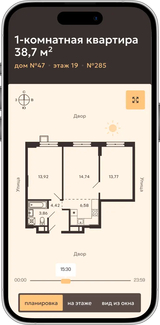 На карточке квартиры отражаются основные характеристики планировочного решения. Также есть возможность выбрать способ покупки и рассчитать ипотеку.