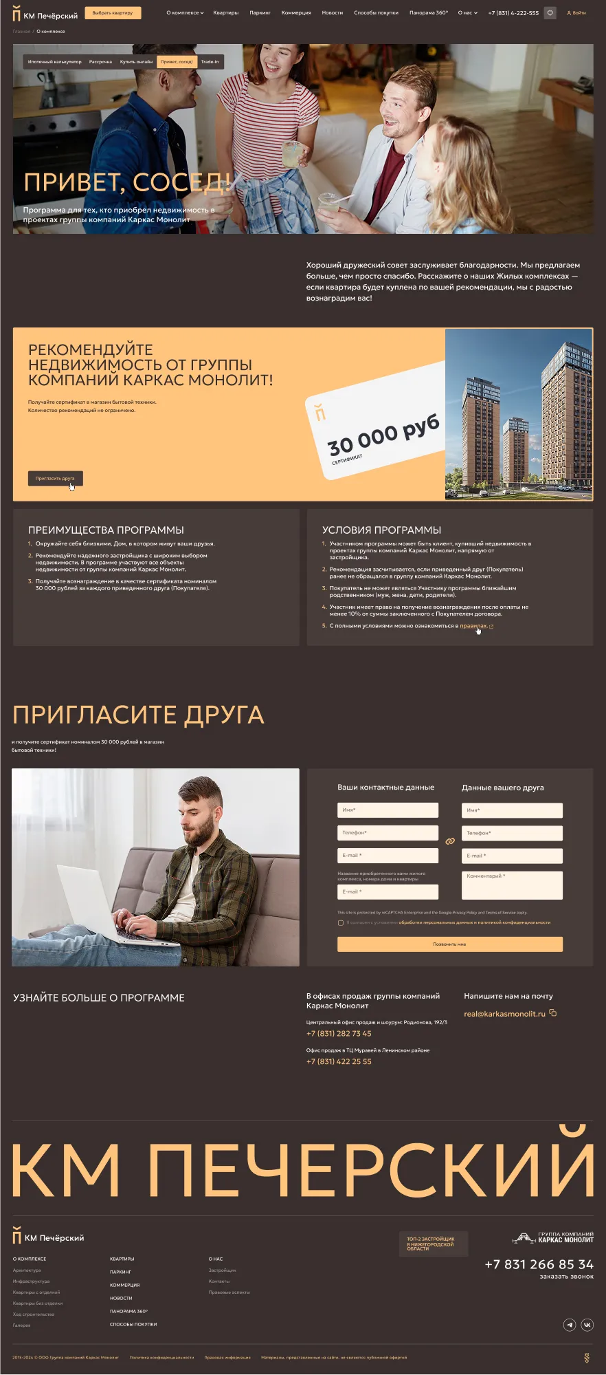 Главная страница рассказывает о преимуществах проекта, дает представление об архитектуре, инфраструктуре и отделке квартир, позволяет подобрать квартиру и машиноместо, а также получить консультацию менеджера.