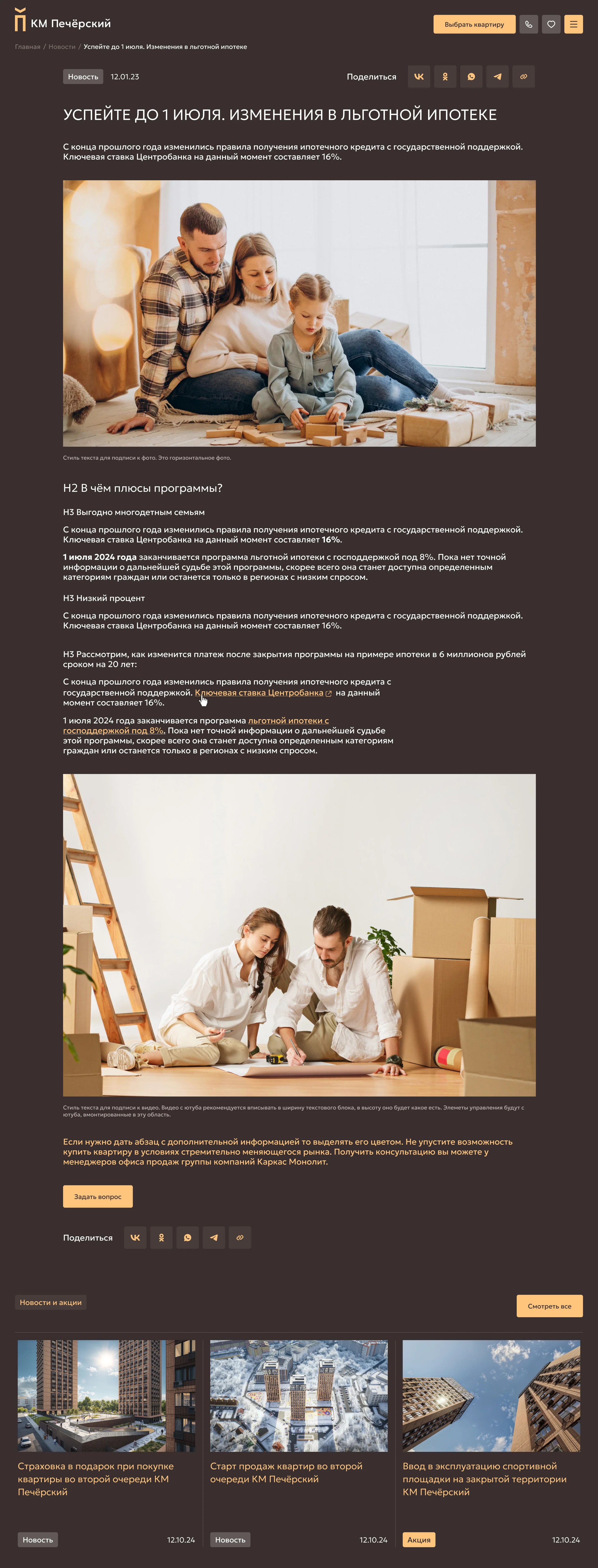 Раздел «Новости» позволяет оперативно информировать пользователей о завершении строительных работ, запуске новых удобств, специальных предложениях и акциях, что создает ощущение вовлеченности и доверия у жильцов.